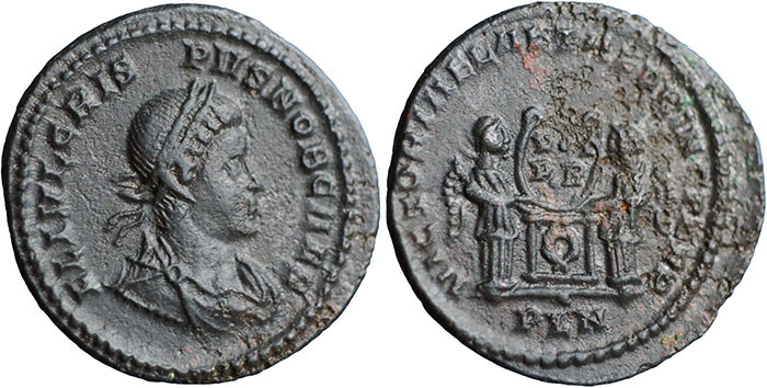 CRISPUS. 317-326 AD. Æ 3 (18mm). FL IVL CRIS-PVS NOB CAES, laureate, draped, cuirassed bust right. ® VICTORIAE LAETAE PRINC PERP, two victories standing holding shield inscribed VOT/PR over altar. Mintmark PLN (London). RIC VII, 174. Rated R2. |
