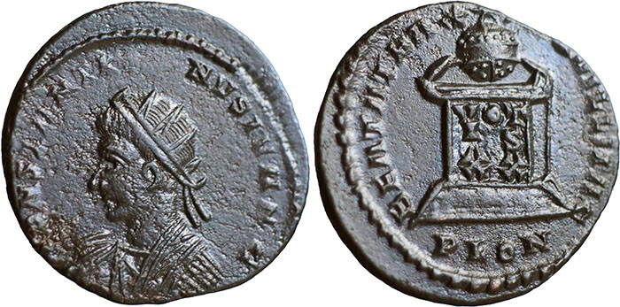 CONSTANTINE II. 317-337 AD. Æ 3 (19mm). CONSTANTI-NVS IVN NC, radiate, draped, cuirassed bust left. ® BEATA TRA-NQVILLITAS altar inscribed VOT/IS/XX. Mintmark PLON (London). RIC VII, 236. |