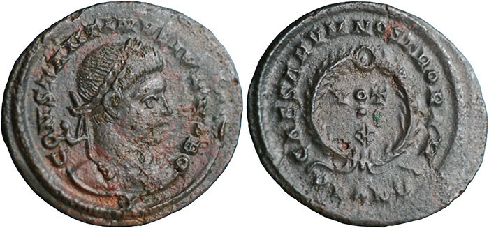 CONSTANTINE II. 317-337 AD. Æ 3 (19mm). CONSTANTINVS IVN NOB C, laureate head right. ® CAESARVM NOSTRORVM around VOT X within wreath. Mintmark PLON crescent (London). RIC VII, 292. |