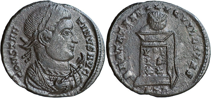 CONSTANTINE I. 307-337 AD. Æ 3 (19mm). CONSTAN-TINVS AVG, laureate, mantled bust right holding eagle tipped sceptre. ® BEATA TRAN-QVILLITAS altar inscribed VOT/IS/XX. Mintmark STR (Trier). RIC VII, 305. |