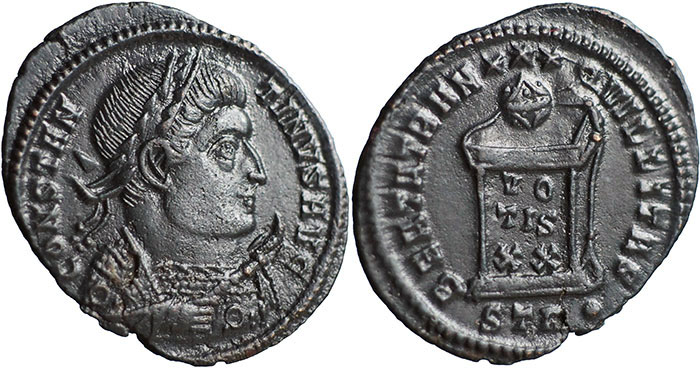 CONSTANTINE I. 307-337 AD. Æ 3 (19mm). CONSTAN-TINVS AVG, laureate, mantled bust right holding eagle tipped sceptre. ® BEATA TRAN-QVILLITAS altar inscribed VO/TIS/XX. Mintmark STR dot (Trier). RIC VII, 342. |