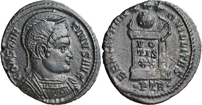 CONSTANTINE I. 307-337 AD. Æ 3 (19mm). CONSTAN-TINVS AVG, helmeted, cuirassed bust right. ® BEATA TRAN-QVILLITAS altar inscribed VO/TIS/XX. Mintmark dot PTR dot (Trier). RIC VII, 368. |