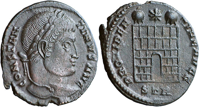 CONSTANTINE I. 307-337 AD. Æ 3 (19mm). CONSTAN-TINVS AVG, laureate head right. ® PROVIDEN-TIAE AVGG, campgate, two turrets, six layers, star above, no door. Mintmark STR (Trier). RIC VII, 449. |