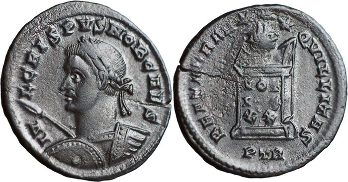 CRISPUS. 317-326 AD. Æ 3 (19mm). IV-L CRISPVS NOB CAES, laureate bust left holding shield and forward pointing spear. ® BEATA TRAN-QVILLITAS altar inscribed VOT/IS/XX. Mintmark PTR (Trier). RIC VII, 308. |