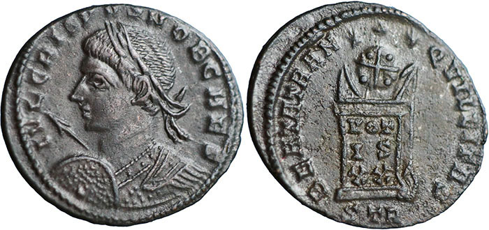 CRISPUS. 317-326 AD. Æ 3 (19mm). IVL CRISPVS NOB CAES, laureate bust left holding shield and forward pointing spear. ® BEATA TRAN-QVILLITAS altar inscribed VOT/IS/XX. Mintmark STR (Trier). RIC VII, 308. |