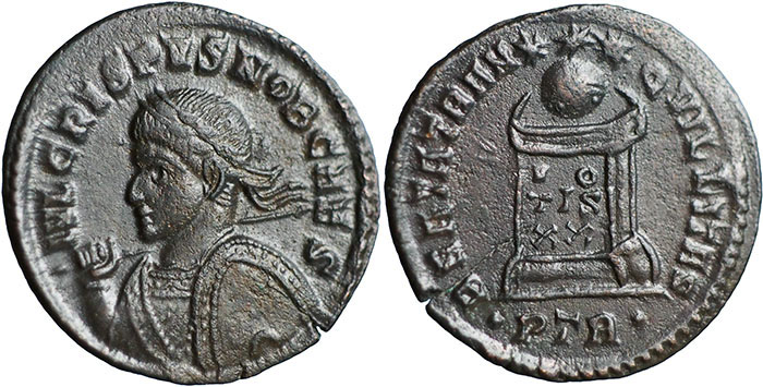 CRISPUS. 317-326 AD. Æ 3 (19mm). IVL CRISPVS NOB CAES, laureate and cuirassed bust left holding spear over right shoulder, shield on left arm. ® BEATA TRAN-QVILLITAS, globe on altar inscribed VO/TIS/XX in three lines, three stars above. Mintmark dot PTR dot (Trier). RIC VII, 372. |