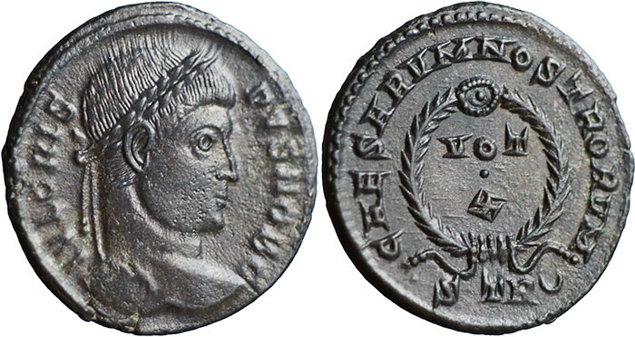CRISPUS. 317-326 AD. Æ 3 (19mm). IVL CRIS-PVS NOB C, laureate head right. ® CAESARVM NOSTRORVM around VOT X within wreath. Mintmark STR crescent (Trier). RIC VII, 440. |