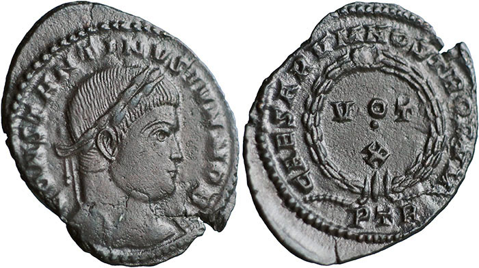 CONSTANTINE II. 317-337 AD. Æ 3 (19mm). CONSTANTINVS IVN NOB C, laureate head right. ® CAESARVM NOSTRORVM around VOT X within wreath. Mintmark PTR (Trier). RIC VII, 433. |