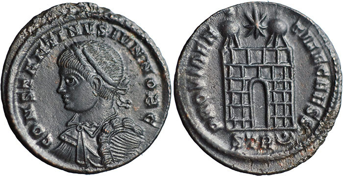 CONSTANTINE II. 317-337 AD. Æ 3 (19mm). CONSTANTINVS IVN NOB C, laureate, draped & cuirassed bust left. ® PROVIDEN-TIAE CAESS, campgate, two turrets, six layers, star above, no door. Mintmark STR dot in crescent (Trier). RIC VII, 479. |