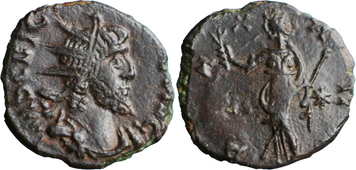 VICTORINUS. 268-270 AD. Æ Antoninianus (17mm). IMP C VICTORINVS PF AVG. Radiate, draped, and cuirassed bust right. ® PAX AVG. Pax standing left, holding olive branch and transverse sceptre; V to left, star to right. Barbarous style. |