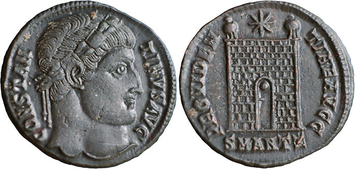 CONSTANTINE I. 307-337 AD. Æ 3 (19mm). CONSTAN-TINVS AVG, square rosette-diademed head right. ® PROVIDEN-TIAE AVGG, campgate, two turrets, thirteen layers, star above, dot in doorway. Mintmark SMANT zeta (Antioch). RIC VII, 81. (rarity r3). |