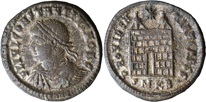 CONSTANTIUS II. 337-361 AD. Æ 3 (19mm). FL IVL CONSTANTIVS NOB C, laureate, draped, cuirassed, bust left. ® PROVIDEN-TIAE CAESS, campgate, two turrets, seven layers, star above, no door. Mintmark SMKB dot (Cyzicus). RIC VII, 38. Some silvering remains. |