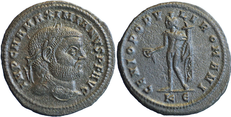 MAXIMIANUS. 286-310 AD. Æ Follis (26mm). IMP C M A MAXIMIANVS PF AVG, Laureate bust right. ® GENIO POPV-LI ROMANI, Genius standing left holding patera and cornucopiae. mm K epsilon (Cyzicus). RIC VI, 12b. |