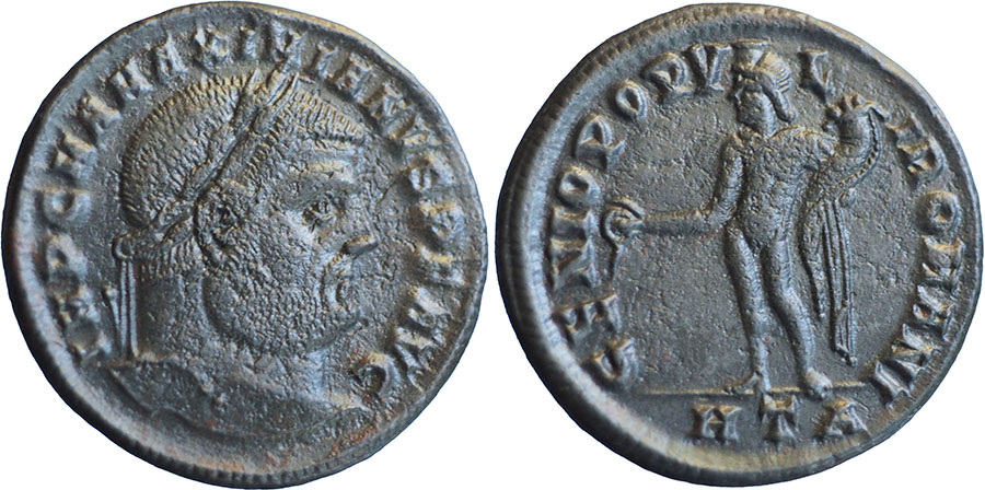 MAXIMIANUS. 286-310 AD. Æ Follis (26mm). IMP C M A MAXIMIANVS PF AVG, Laureate bust right. ® GENIO POPV-LI ROMANI, Genius standing left holding patera and cornucopiae. mm HTA (Heraclea). RIC VI, 19b. |