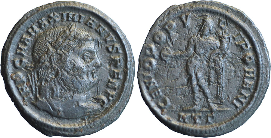MAXIMIANUS. 286-310 AD. Æ Follis (26mm). IMP C M A MAXIMIANVS PF AVG, Laureate bust right. ® GENIO POPV-LI ROMANI, Genius standing left holding patera and cornucopiae. mm HT gamma (Heraclea). RIC VI, 19b. |