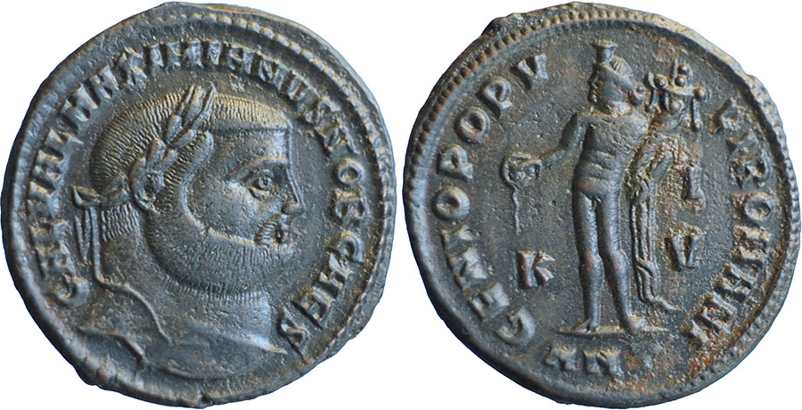 GALERIUS. As Caesar 293-305 AD. Æ Follis (26mm). GAL VAL MAXIMIANVS NOB CAES, Laureate head right. ® GENIO POPV-LI ROMANI, Genius standing left holding patera and cornucopiae. K in left field, I over V in right field, mm ANT (Antioch). RIC VI, 55b. |