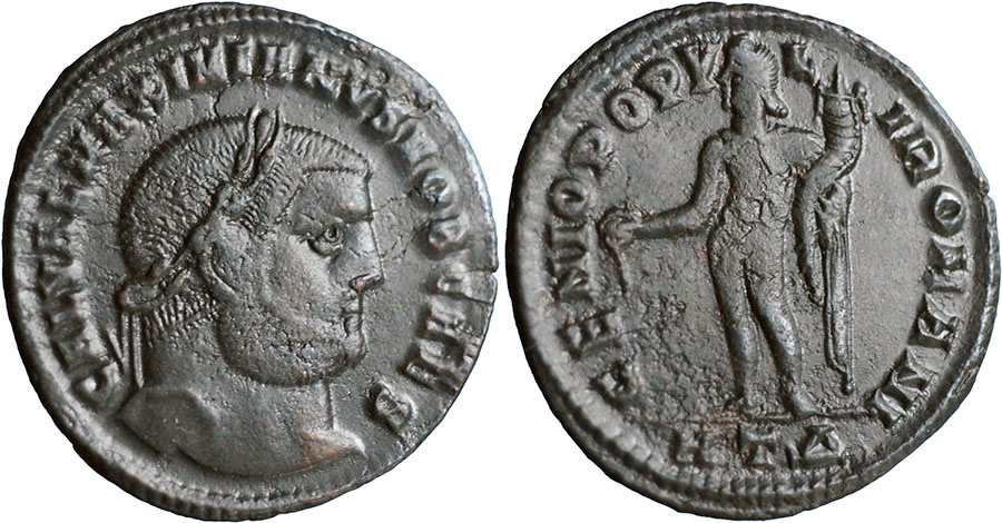 GALERIUS. As Caesar 293-305 AD. Æ Follis (26mm). GAL VAL MAXIMIANVS NOB CAES, Laureate head right. ® GENIO POPV-L-I ROMANI, Genius standing left holding patera and cornucopiae. mm HT delta (Heraclea). RIC VI, 20b. |