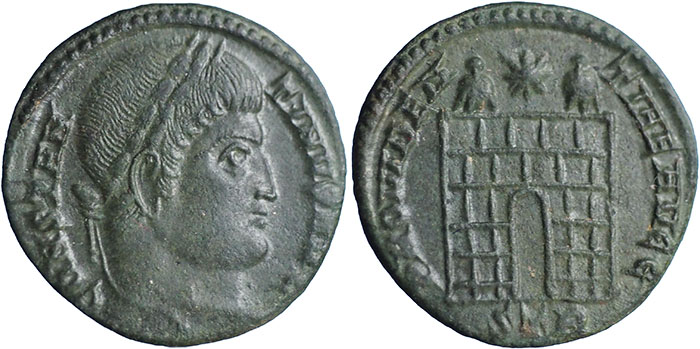 CONSTANTINE I. 307-337 AD. Æ 3 (19mm). CONSTAN-TINVS AVG, laureate head right. ® PROVIDEN-TIAE AVGG, campgate, two turrets, six layers, star above, no door. Mintmark STR (Trier). RIC VII, 449. |
