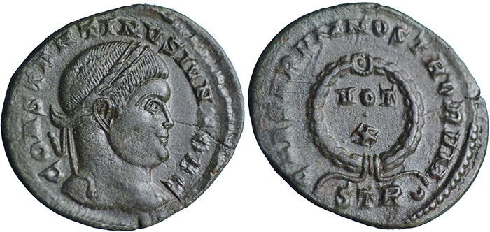 CONSTANTINE II. 317-337 AD. Æ 3 (19mm). CONSTANTINVS IVN NOB C, laureate head right. ® CAESARVM NOSTRORVM around VOT X within wreath. Mintmark STR crescent (Trier). RIC VII, 441. |