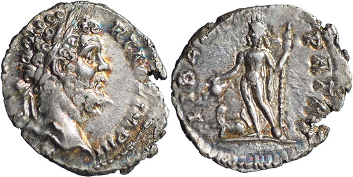 SEPTIMIUS SEVERUS. 193-211 AD. Ar Denarius. LIBERO PATRI. Liber standing half-left, cloak over left shoulder, holding oenochoe and thyrsus; on left, panther standing left, head turned back to catch drips from jug. RSC 301. |