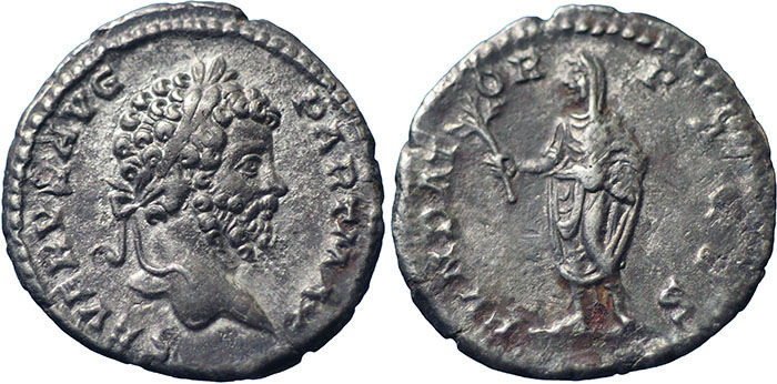 SEPTIMIUS SEVERUS. 193-211 AD. Ar Denarius. FVNDATOR PACIS. Septimius veiled, standing half-left, holding branch and roll. RSC 203. |
