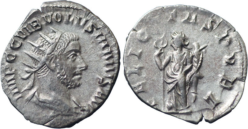 VOLUSIAN. 251-253 AD. Ar Antoninianus. Mediolanum Mint. IMP C C VIB VOLVSIANVS AVG, radiate, draped and cuirassed bust right. ® FELICITAS PVBL, Felicitas standing left, holding caduceus and cornucopiae. RSC 32. |