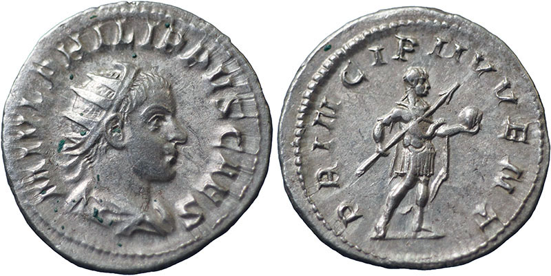 PHILIP II. 247-249 AD. Ar Antoninianus. M IVL PHILIPPVS CAES, radiate, draped and cuirassed bust right. ® PRINCIPI IVVENT, Philip II, in military dress, standing right, holding globe and transverse spear. RSC 54. |