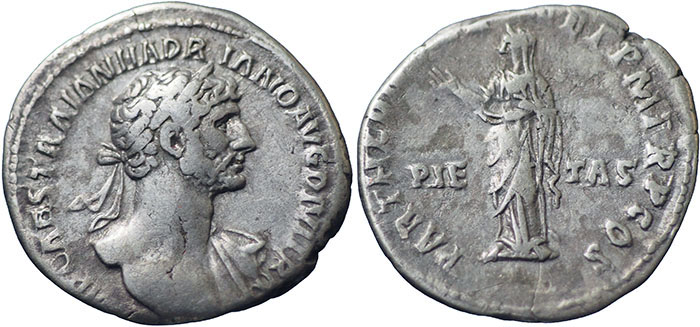HADRIAN. 117-138 AD. Ar Denarius. PARTH F DIVI NER NEP P M TR P COS around, PIE-TAS across field. Pietas, veiled, standing left, raising right hand. RSC 1023b. |