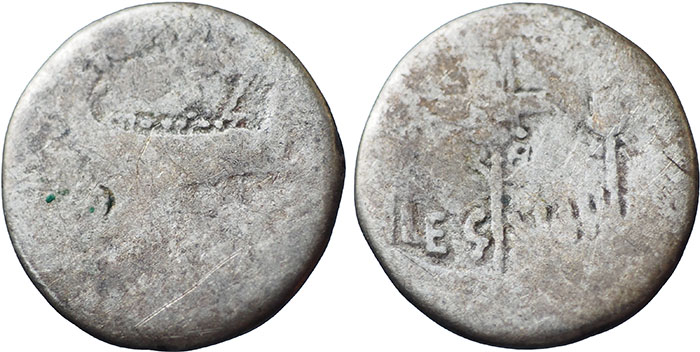 MARK ANTONY. Ar Denarius. ANT AVG III VIR R P C. Galley right. ® LEG VIII Legionary eagle between two standards. RSC 35. Found South Yorkshire, late 70's early 80's. |