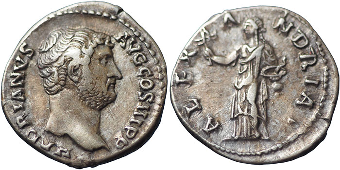 HADRIAN. 117-138 AD. Ar Denarius. ALEXANDRIA. Alexandria standing left, holding sistrum and snake in basket. RSC 154. Rare. |