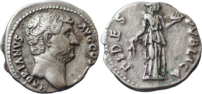 HADRIAN. 117-138 AD. Ar Denarius. FIDES PVBLICA. Fides, draped, standing right, holding corn-ears and basket of fruit. RSC 716. |