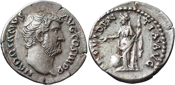 HADRIAN. 117-138 AD. Ar Denarius. PROVIDENTIA AVG. Providentia standing left, holding sceptre and pointing with right hand at globe at feet. RSC 1204. |