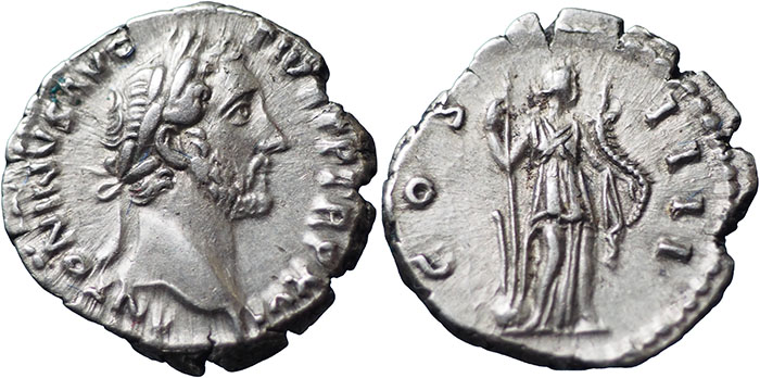 ANTONINUS PIUS. 138-161 AD. Ar Denarius. COS IIII. Fortuna standing right, holding rudder on globe and cornucopiae. RSC 267. |