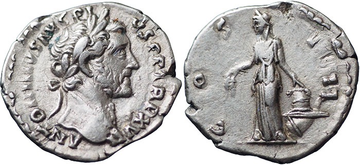 ANTONINUS PIUS. 138-161 AD. Ar Denarius. COS IIII. Annona standing left, holding two corn-ears and resting left hand on modius, filled with corn-ears, set on prow. RSC 291. |