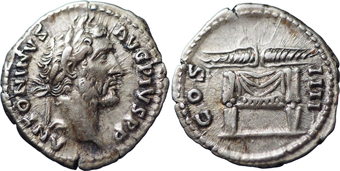 ANTONINUS PIUS. 138-161 AD. Ar Denarius. COS IIII. Thunderbolt, winged, lying on draped throne. RSC 345. |