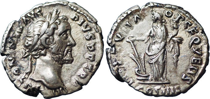 ANTONINUS PIUS. 138-161 AD. Ar Denarius. FORTVNA OBSEQVENS around, COS IIII in exergue. Fortuna standing left, holding cornucopiae and patera above rudder on prow left. RSC 390a. |