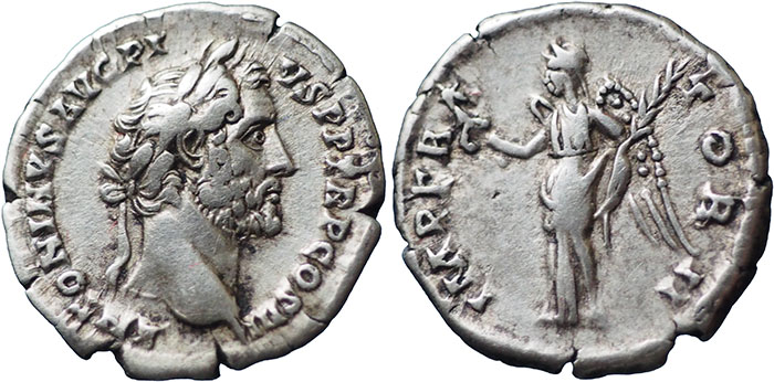 ANTONINUS PIUS. 138-161 AD. Ar Denarius. IMPERATOR II. Victory standing front, head left, holding wreath and palm. RSC 437. |