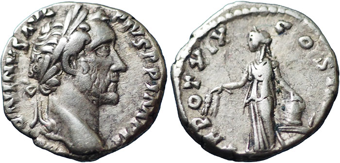 ANTONINUS PIUS. 138-161 AD. Ar Denarius. TR POT XIX COS IIII. Annona standing left, holding two ears of corn and resting left hand on modius set on prow to right; rudder rests against it. RSC 983. |