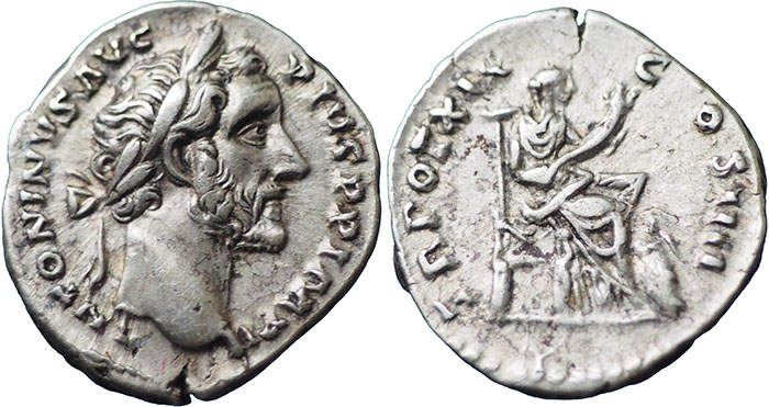 ANTONINUS PIUS. 138-161 AD. Ar Denarius. TR POT XIX COS IIII. Annona seated right on throne, holding cornucopiae in both hands, modius at her feet. RSC 985. |