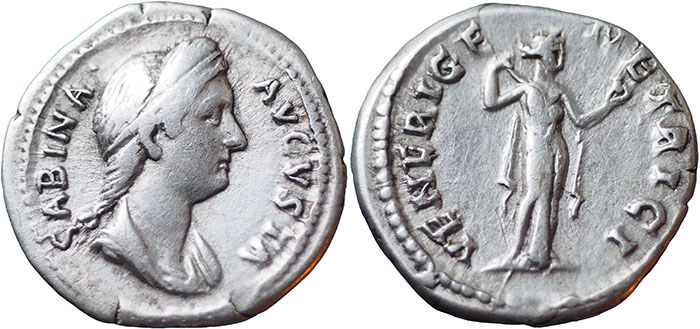 SABINA. Wife of Hadrian. Ar Denarius. VENERI GENETRICI. Venus standing towards right, holding apple and drawing a fold of drapery from left shoulder. RSC 73. |