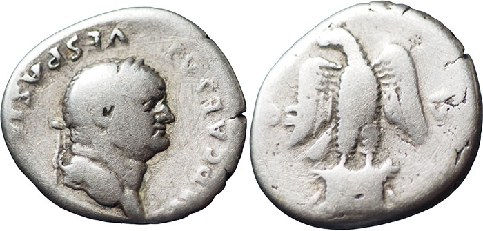 VESPASIAN. 69-79 AD. Ar Denarius. COS VII. Eagle on altar, head left. RSC 121. |