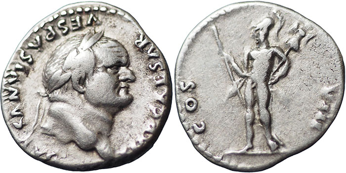 VESPASIAN. 69-79 AD. Ar Denarius. COS VIII. Mars standing left, holding trophy and spear. RSC 185. |