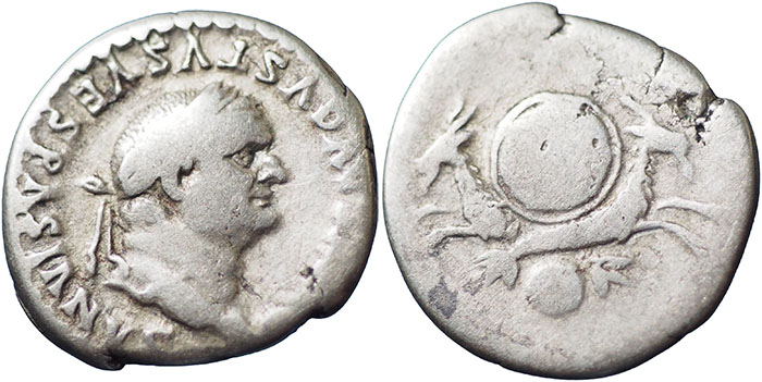 DIVVS VESPASIAN. 69-79 AD. Ar Denarius. S C on shield supported by two capricorns back to back, globe below. RSC 497. |