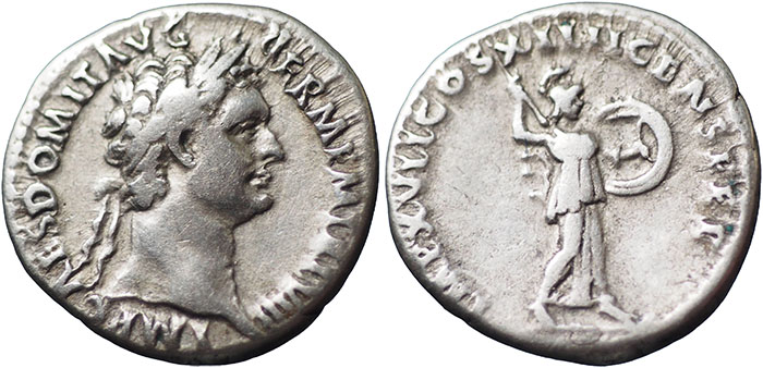 WRS 10211 | DOMITIAN. 81-96 AD. Ar Denarius. IMP XVII COS XIIII CENS P P P. Minerva standing right holding shield and brandishing javelin. RSC 246. | £125.00 |
