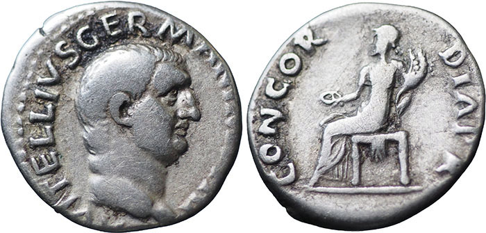 VITELLIUS. Ar Denarius. CONCORDIA P R. Concordia seated left, holding patera and cornucopiae. RSC 20. |