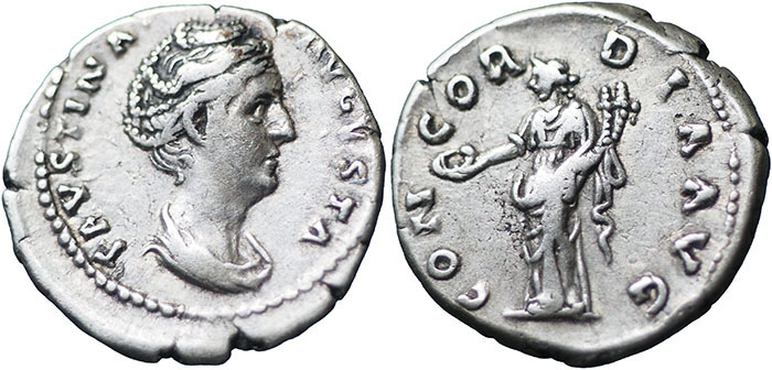FAUSTINA I. Wife of Antoninus Pius. Ar Denarius. CONCORDIA AVG. Concordia standing front, head left, holding patera and double cornucopiae. RSC 151. |