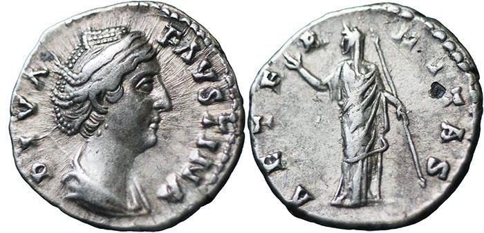 DIVVS FAUSTINA I. Wife of Antoninus Pius. Ar Denarius. AETERNITAS. Aeternitas or Juno standing front, head left, raising the right hand and holding sceptre. RSC 26. |