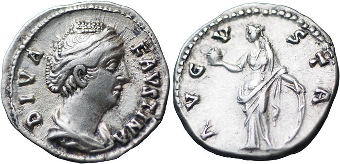 DIVVS FAUSTINA I. Wife of Antoninus Pius. Ar Denarius. AVGVSTA. Venus standing left, holding apple and leaning on shield. RSC 73. |