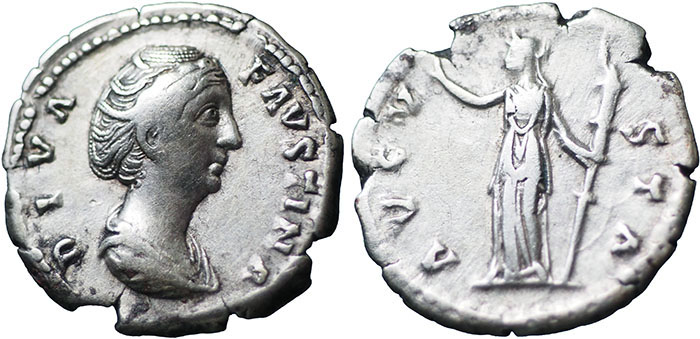DIVVS FAUSTINA I. Wife of Antoninus Pius. Ar Denarius. AVGVSTA. Ceres (or Aeternitas) standing left, holding out right hand and holding torch in left. RSC 101a. |