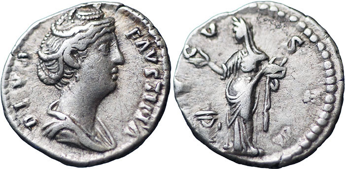 DIVVS FAUSTINA I. Wife of Antoninus Pius. Ar Denarius. AVGVSTA. Pietas standing left, holding right hand over altar and holding box with open lid in left. RSC 124. |